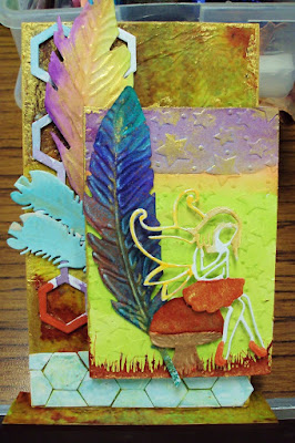 I blended Distress inks over the whole card, (Salty Ocean, Picked Raspberry and Mustard Seed), this combination was a little too vivid on this occasion, so I toned it down with a gesso wash (white gesso and water).