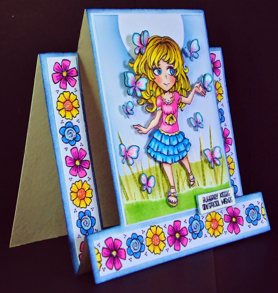 The fabulous Dragon was stamped in Versamark, and heat embossed using a Wow black sparkle powder, the seal was also stamped with Versamark and heat embossed using Wow gold sparkle powder. The rocks were stamped and coloured on a separate piece of card, and fussy cut, then stacked onto the main image. I added the sentiment, also in Black sparkle powder, some pink card and a bit of ribbon, to make it a bit more girly !!!