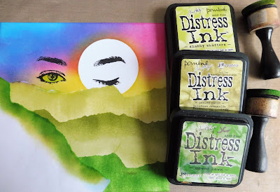 I first made a background using Brusho crystal paints, dried it, and using my stamp platform I stamped the beautiful faerie onto it, at the same time I also stamped her onto a piece of copy paper, which I fussy cut, to use as a mask.